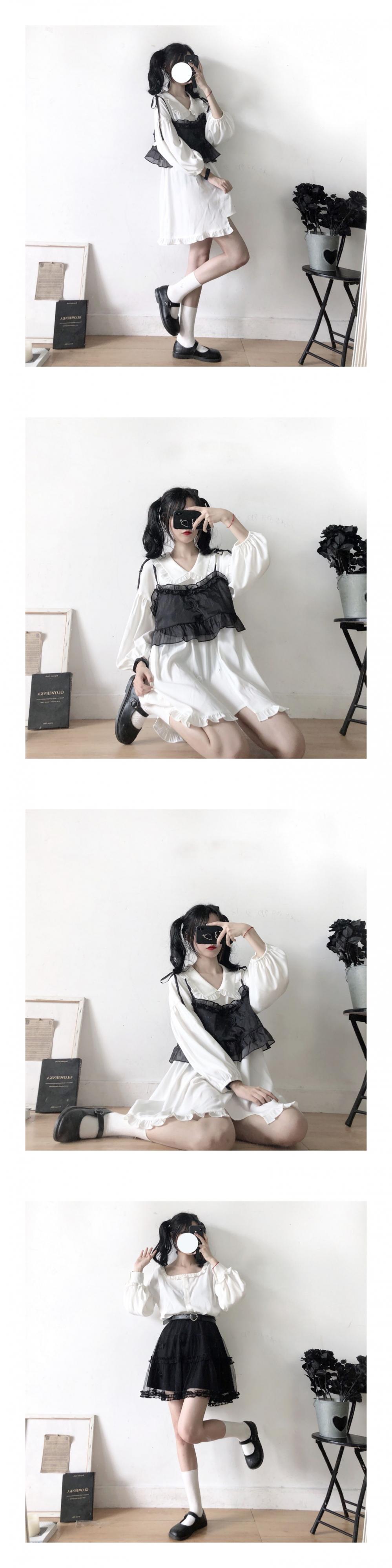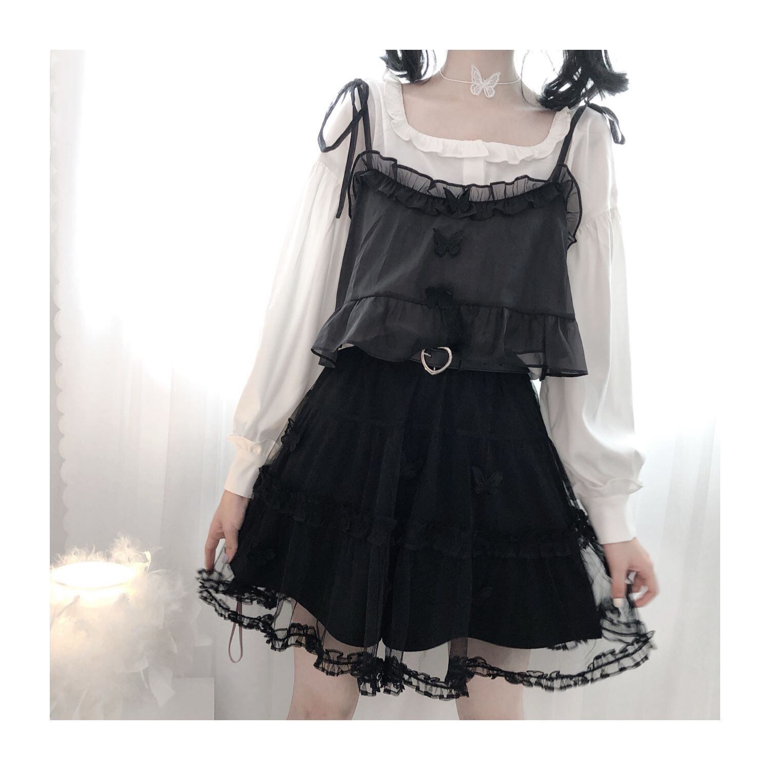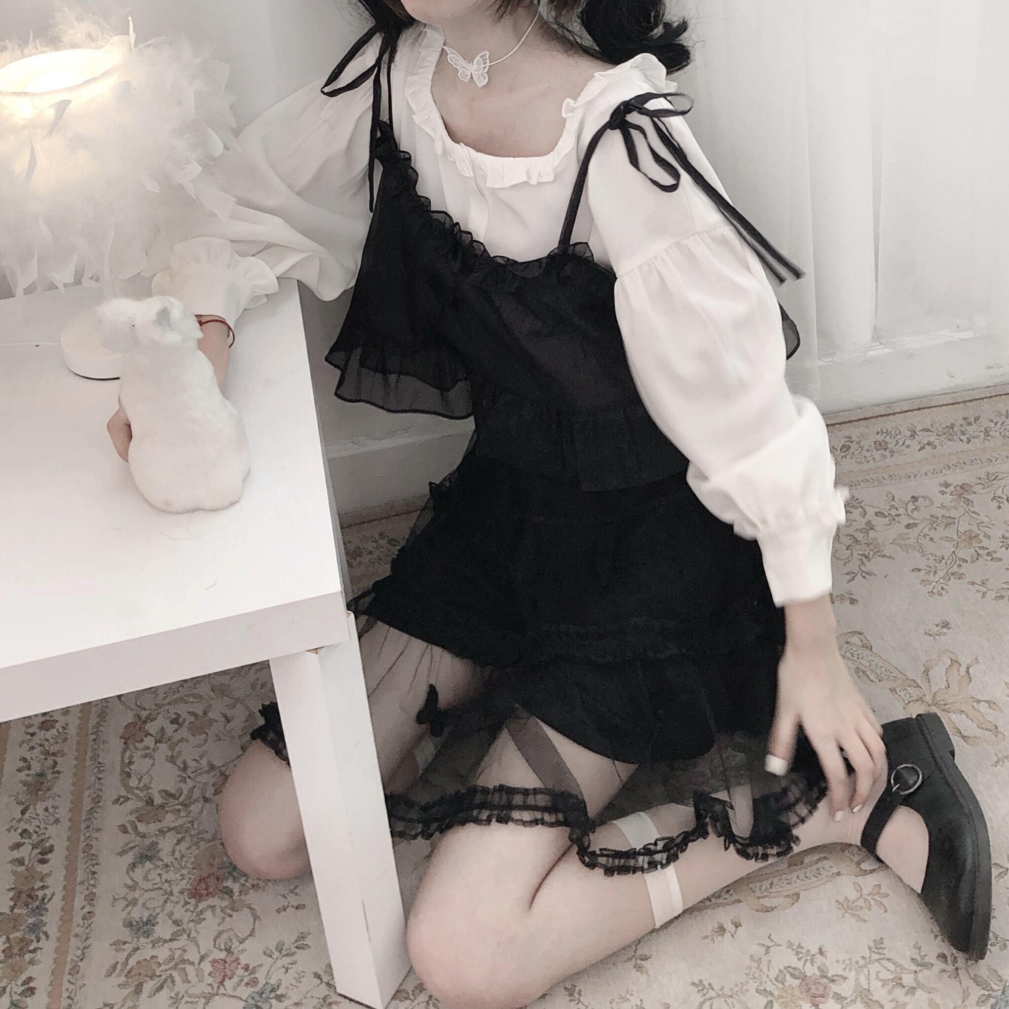 色:ホワイトロングスリーブトップ,ブラックサスペンダー,黒ガーゼスカート、ラブレザーベルトを送る,蝶ネクタイと白いドレス