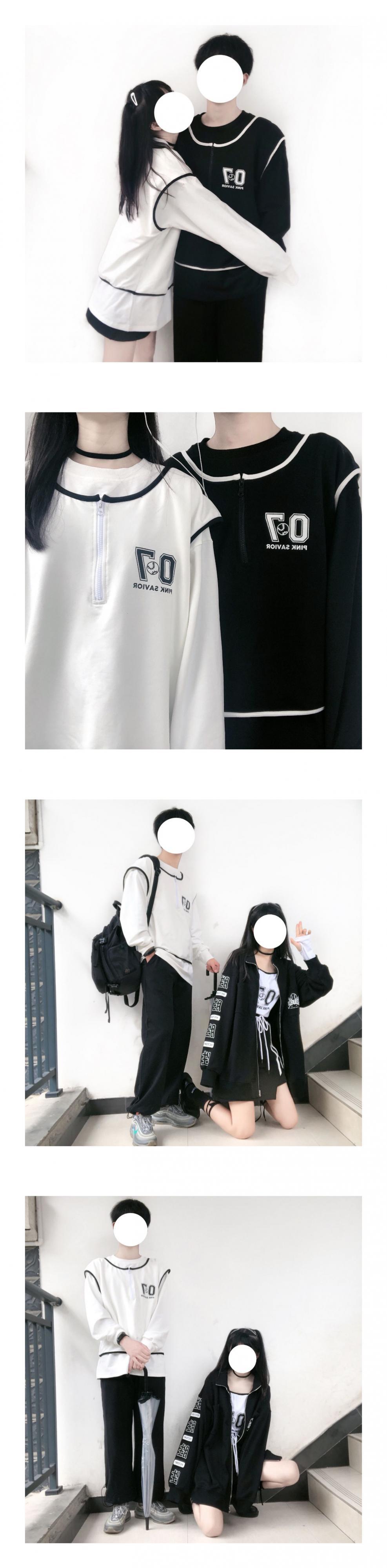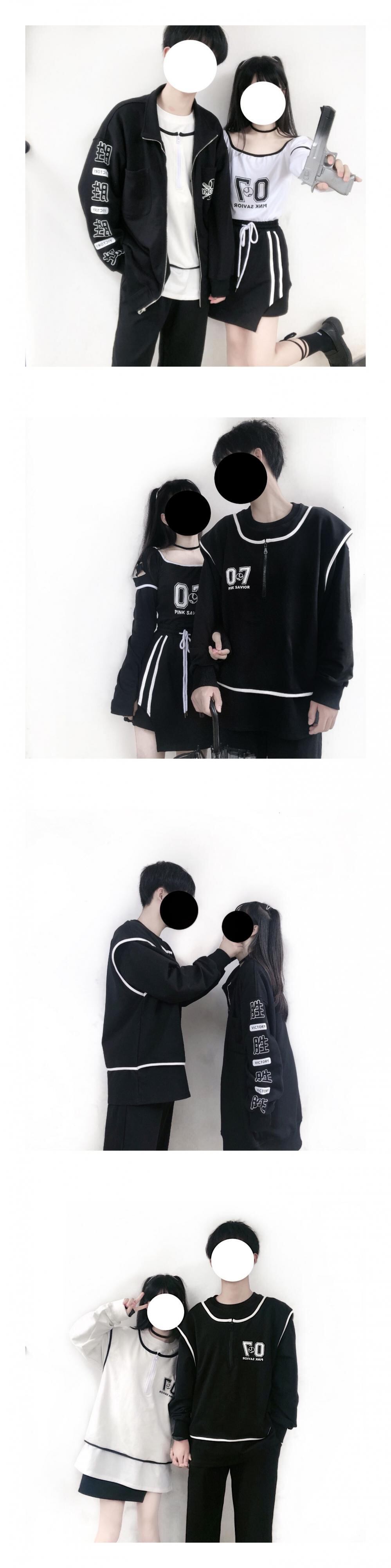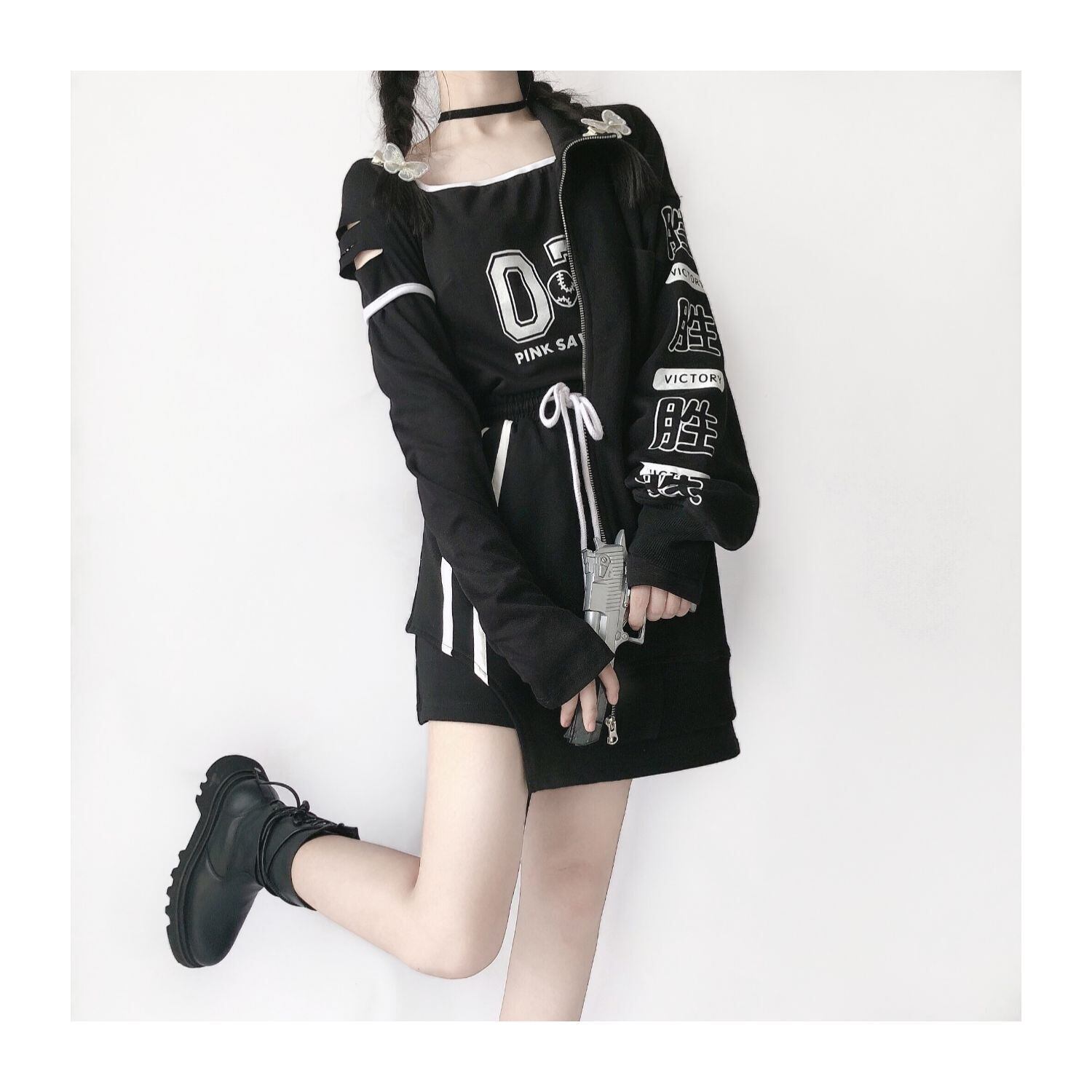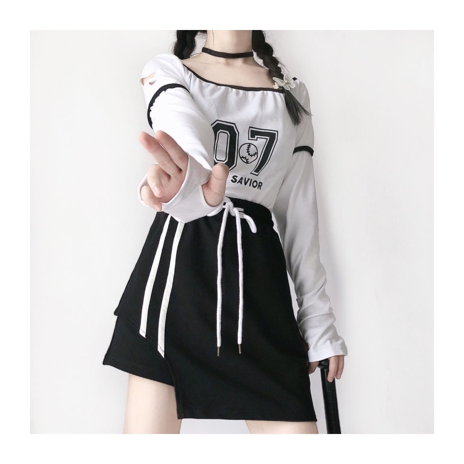 色:黒い長袖,白い長袖,黒の野球ジャケット,不規則なスカートのステッチ,黒のパッチワークスウェットシャツ,白いステッチのセーター