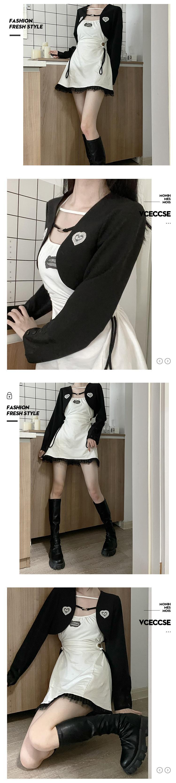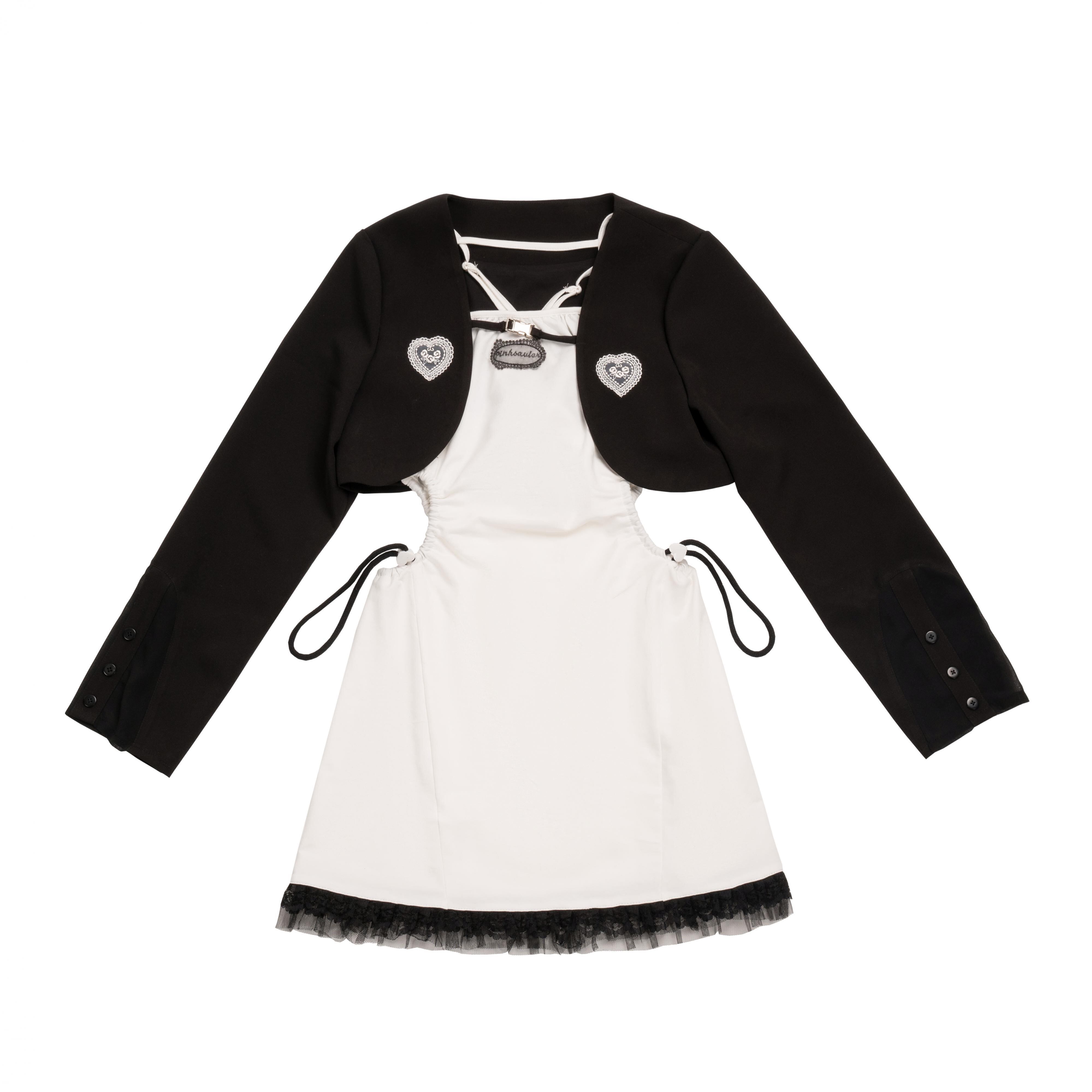 色:黒のサスペンダードレス(袖を含む),白いサスペンダースカート(袖を含む),短い日焼け止めスーツ