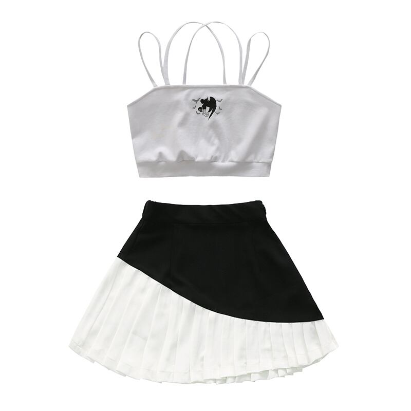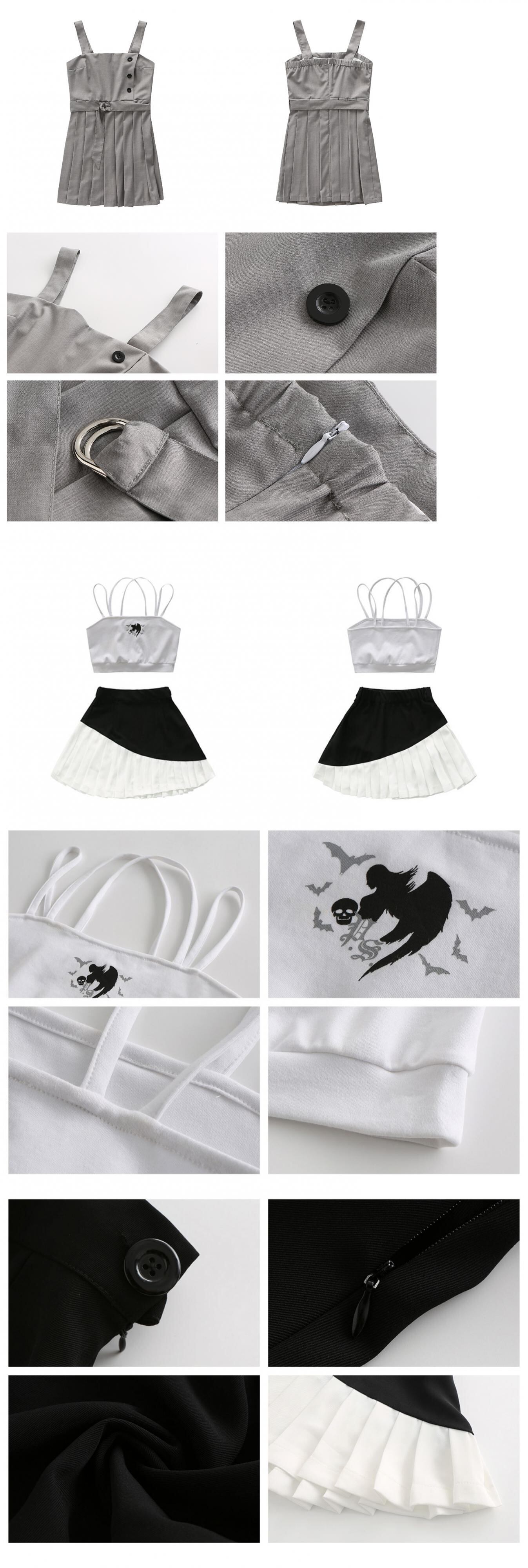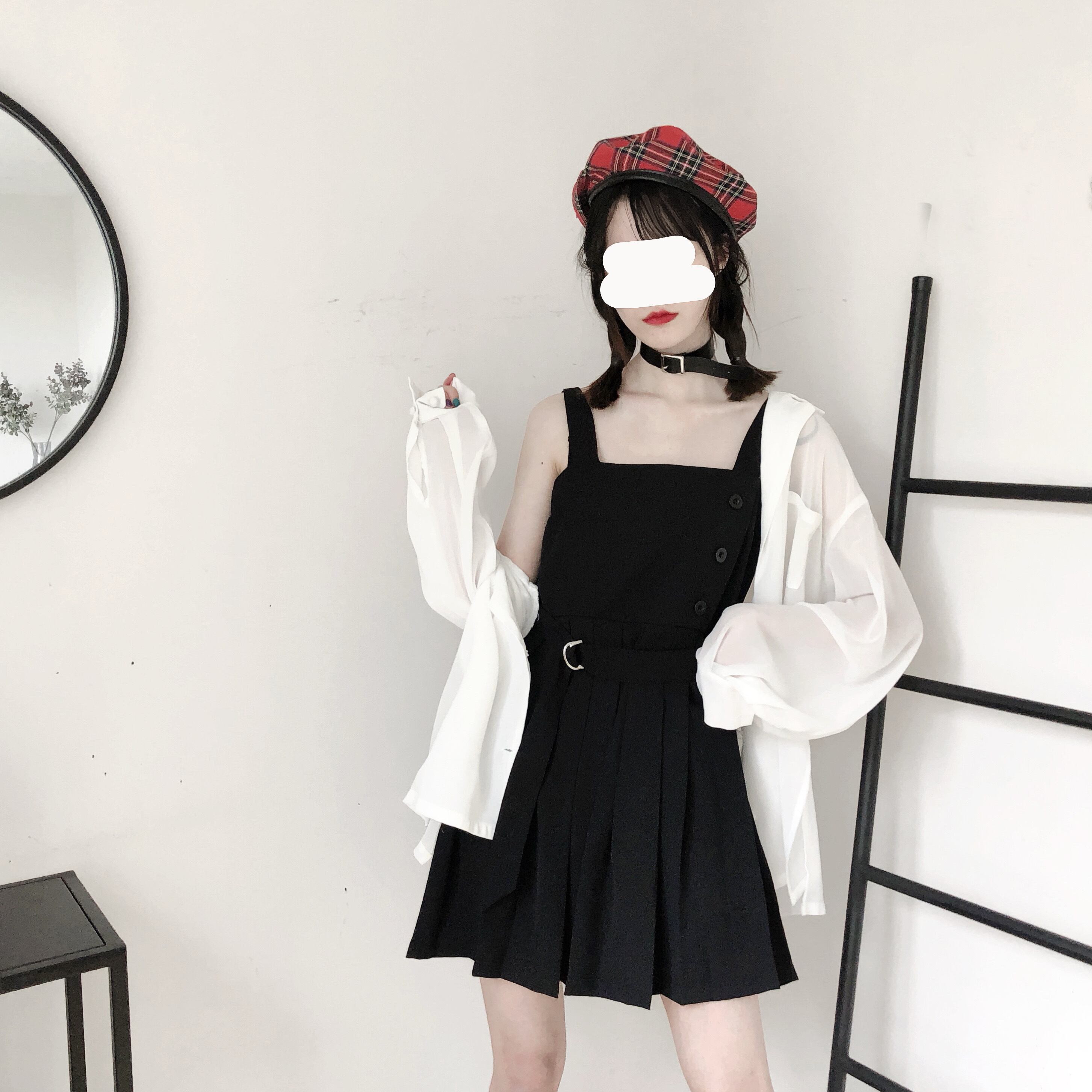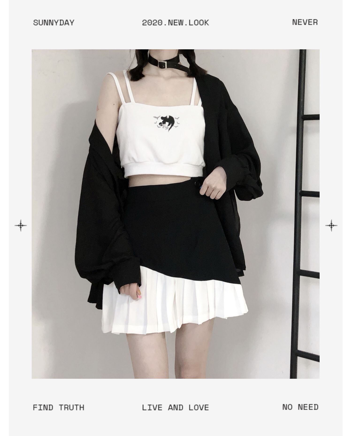 色:白いダブルショルダーストラップスリング,黒のダブルショルダーストラップスリング,ホワイトデザインのシフォン日焼け止めシャツ,ブラックデザインのシフォン日焼け止めシャツ,黒のプリーツサスペンダースカート,グレーのプリーツサスペンダースカート,黒と白のプリーツスカート