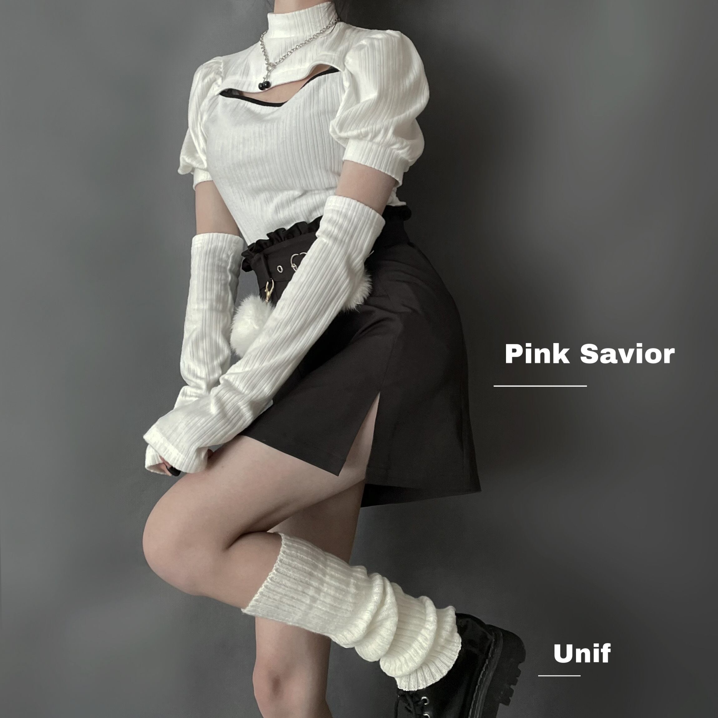 色:ホワイトオープンチェストトップ+袖,黒のファーボールスカート