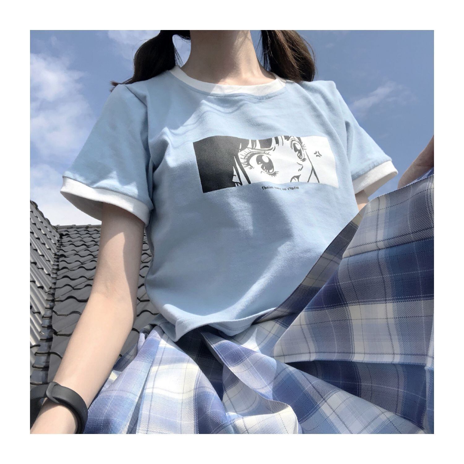 夏服ブルーホワイトカラープリント薄手Tシャツショートトップス レディース ピンク 大人ガーリー スウィート キュート カジュアル 夏物 pinksavior35263380444 | LADY GHOST