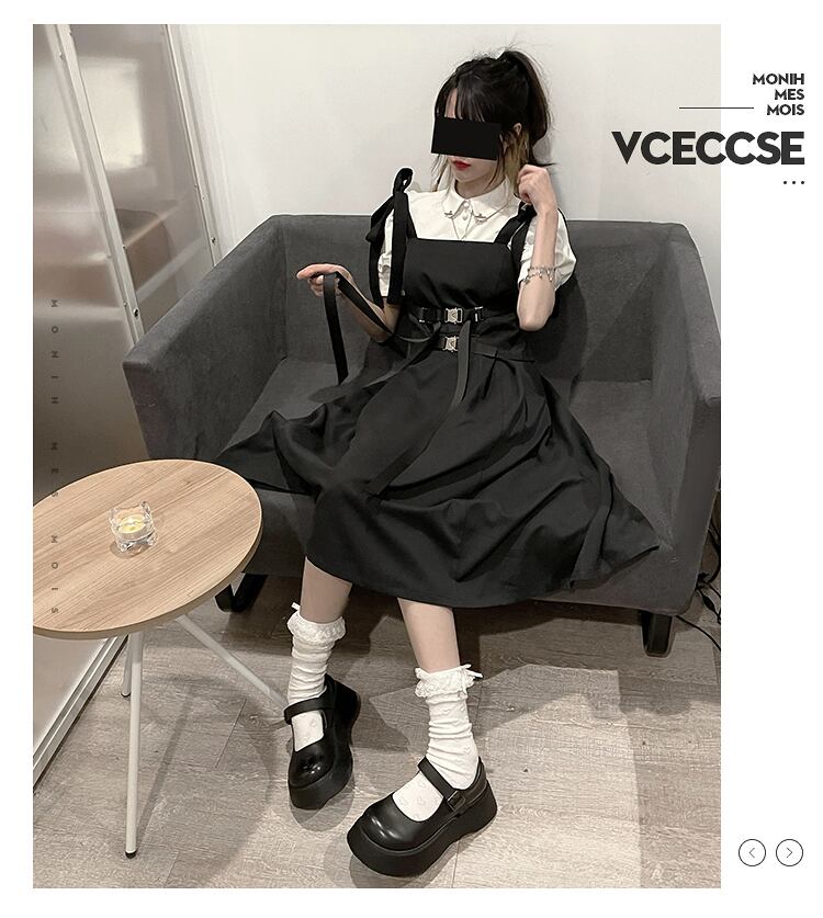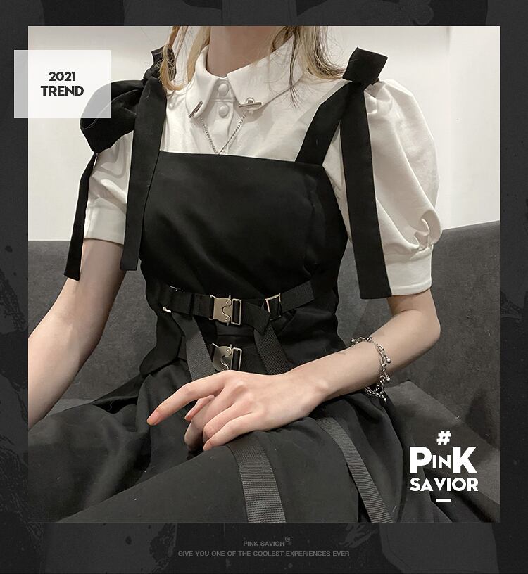 色:小さなスクエアネックパフスリーブ,ロングレースアップ機能サスペンダースカート