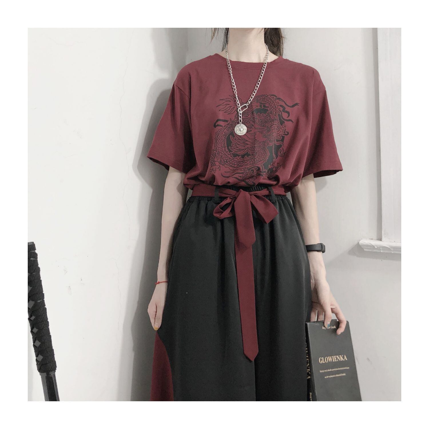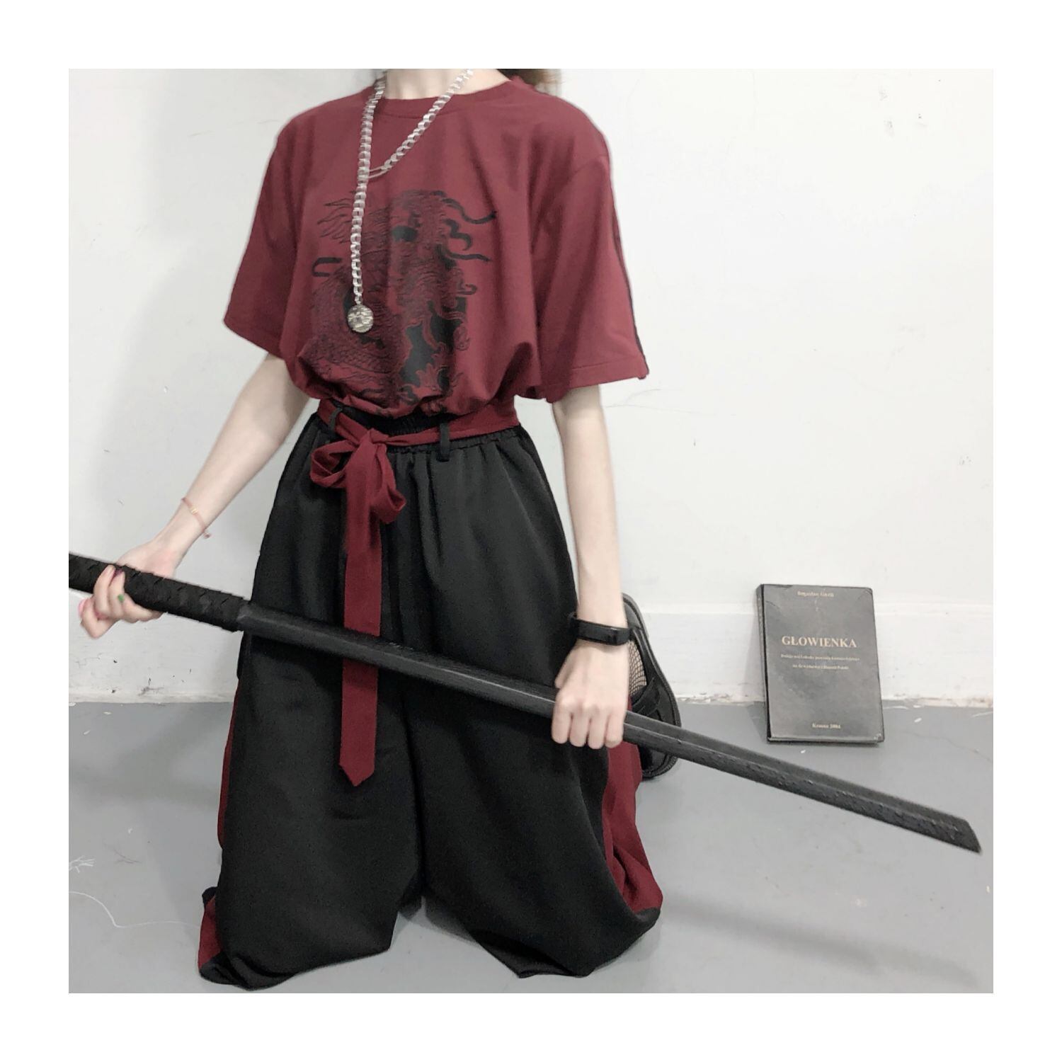 色:シュヴァリエパンツ,ビッグパンツ,グレーのカーディガン,赤い女性のバックスリットデザイン半袖,レギュラーレッド半袖