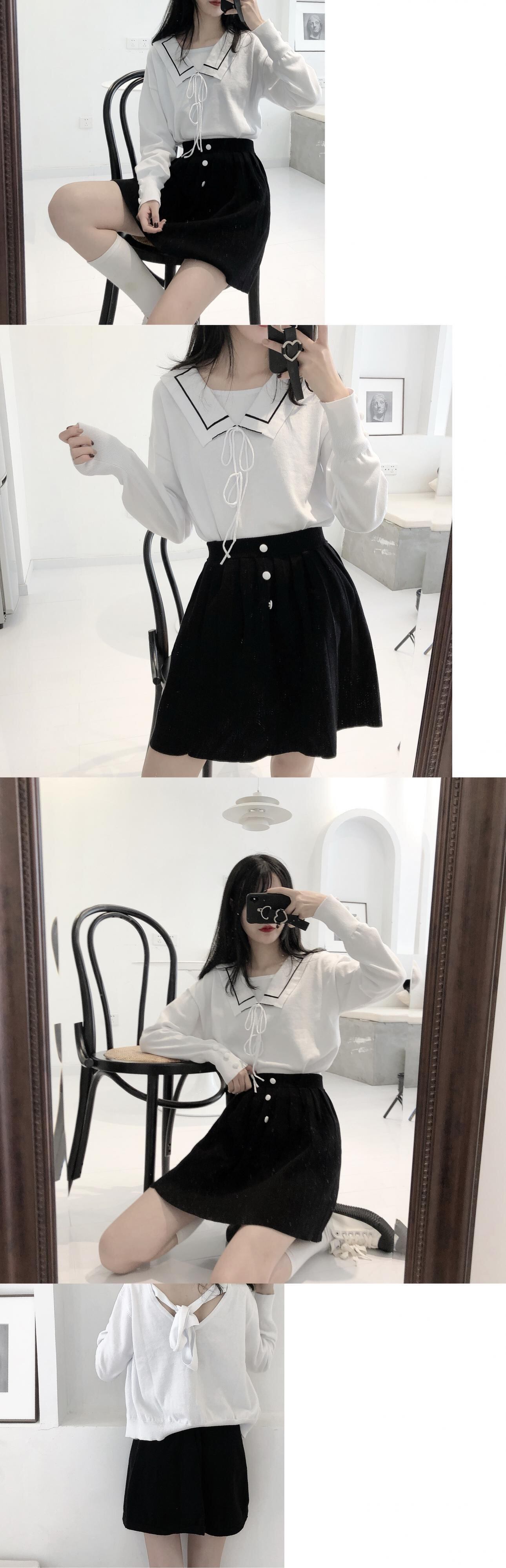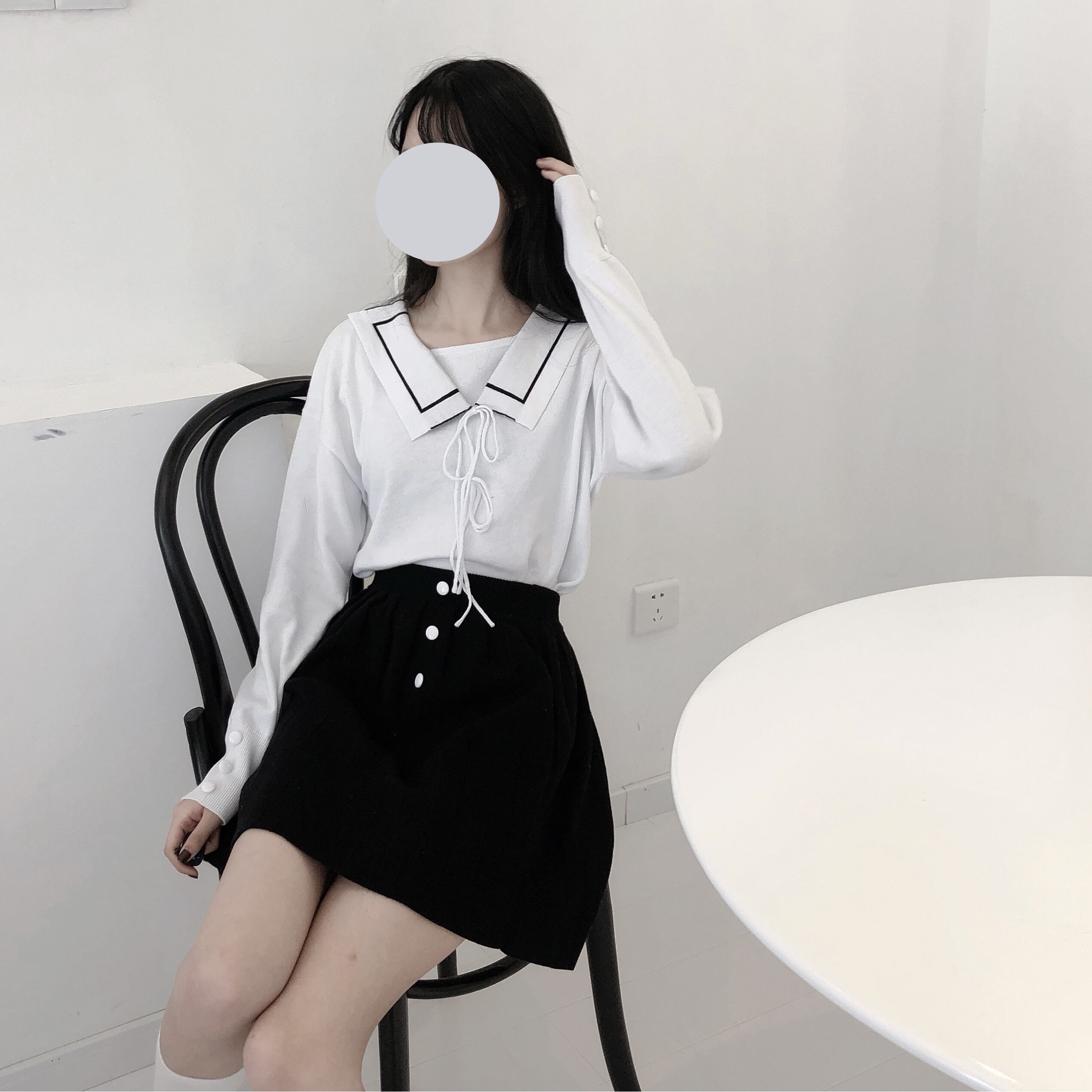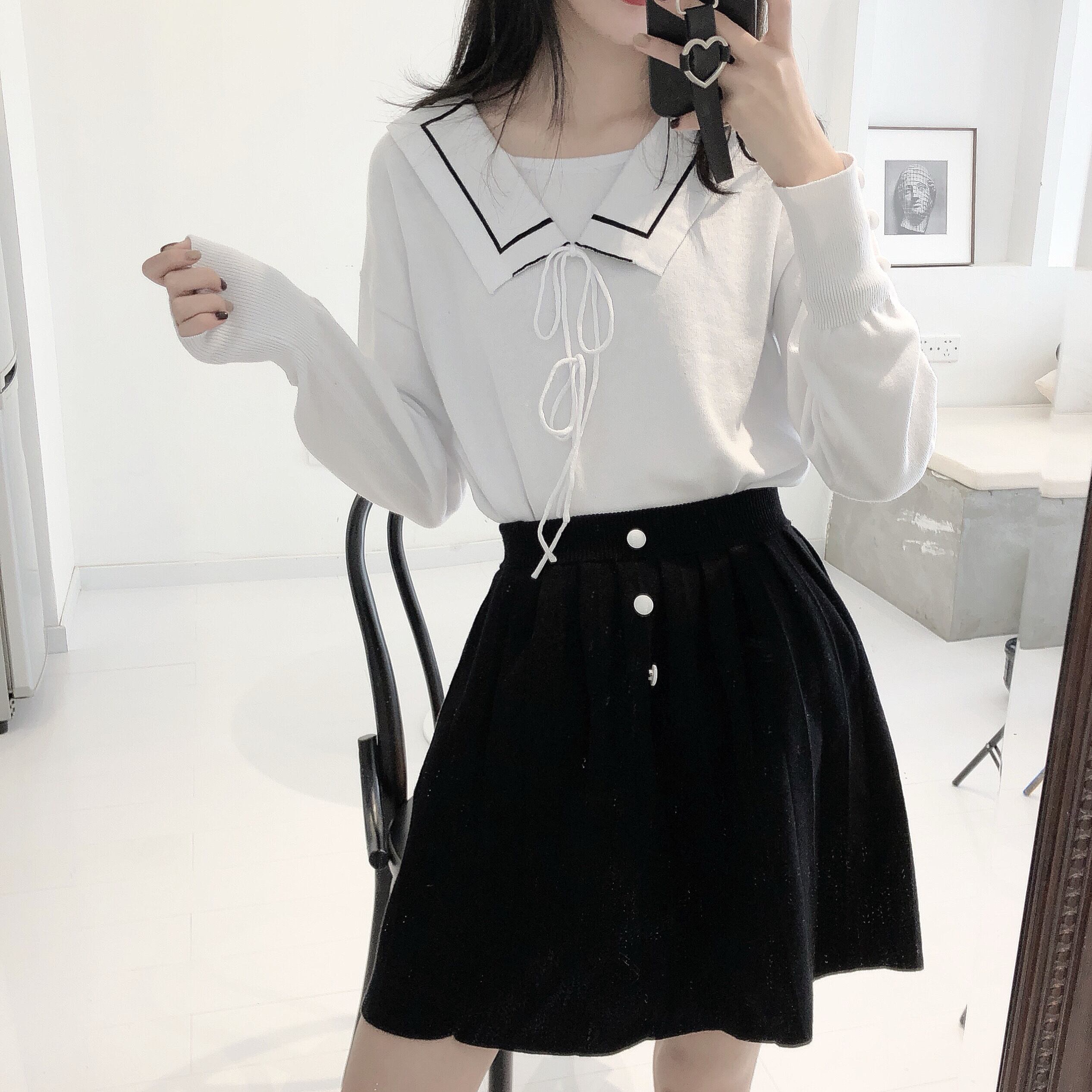 色:ネクタイ付きホワイトニットカーディガン,ブラックサスペンダースカート,黒のプリーツニットスカート,スクエアカラーフレンチトップ