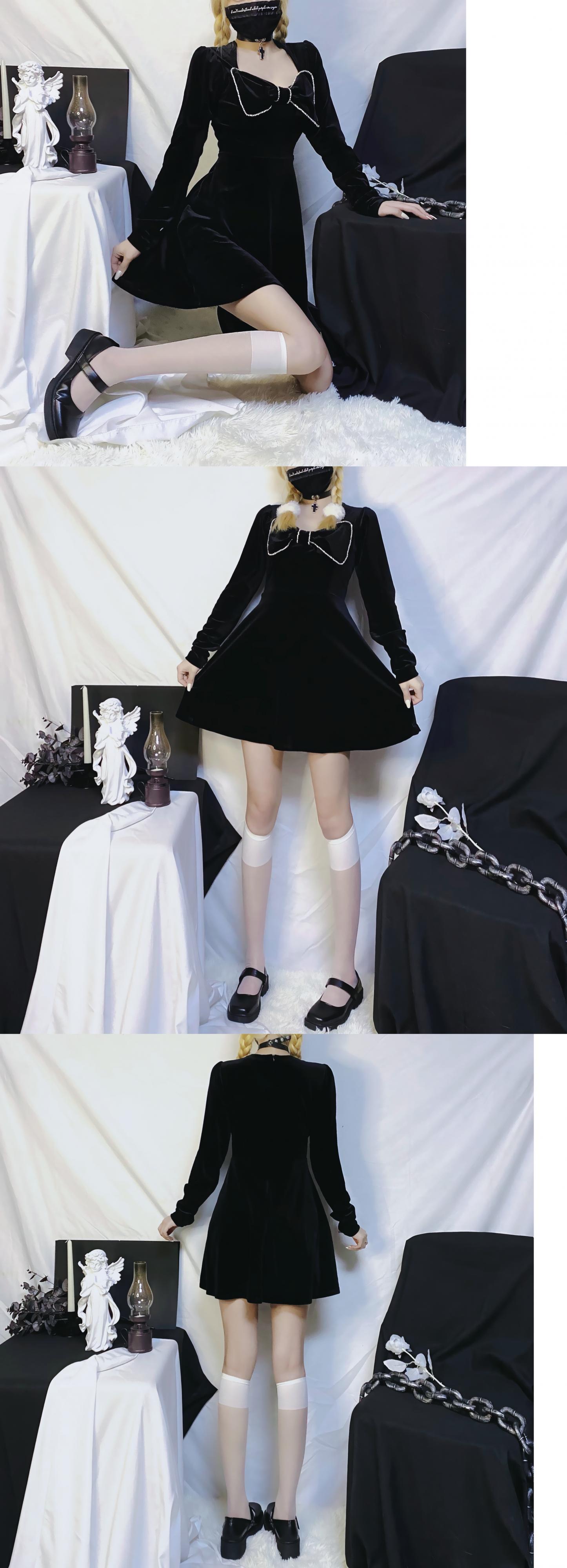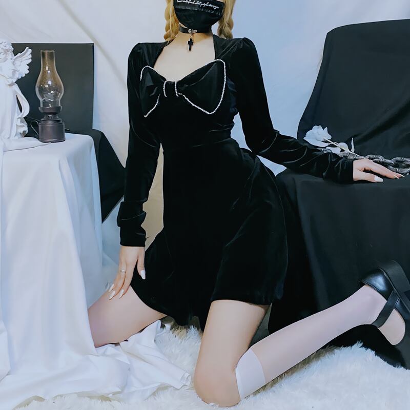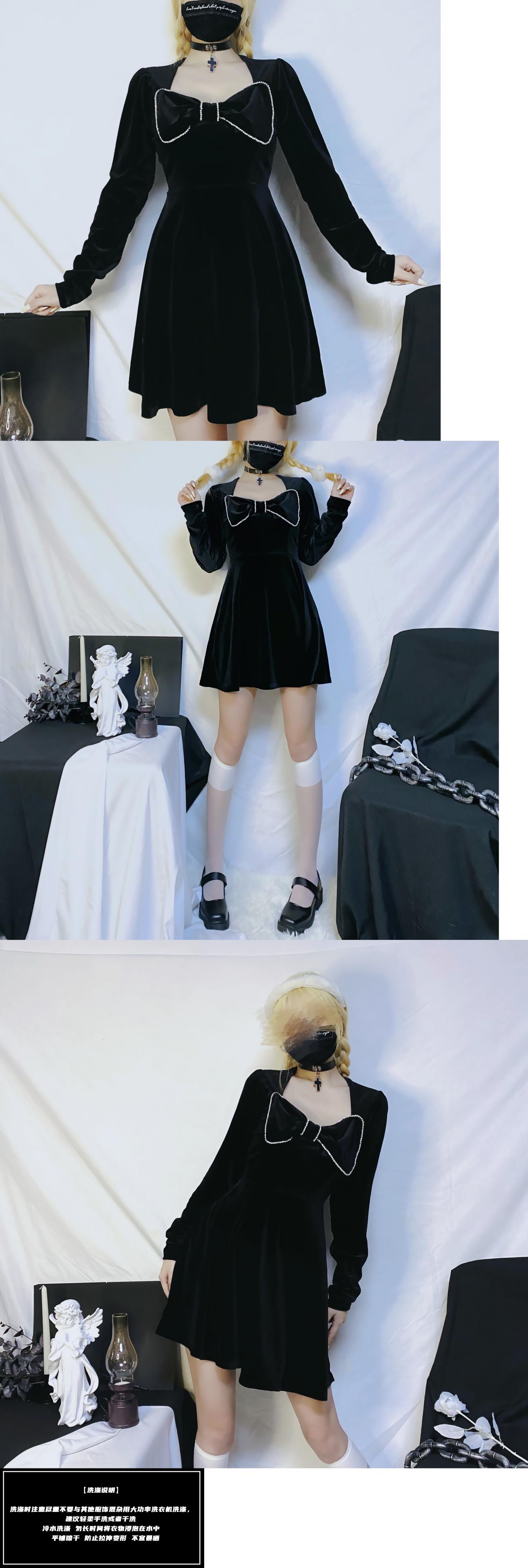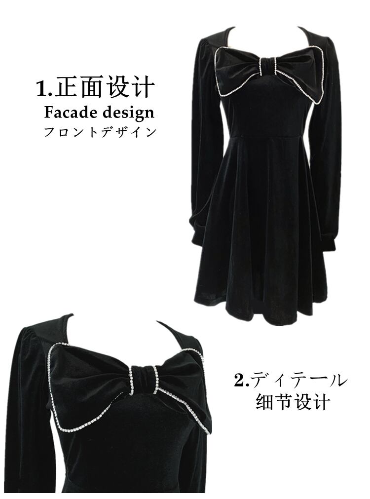 LADY GHOSTブラックワンピースダークゴールド厚みリボンスタンダード レトロ 大人ガーリー スウィート キュート カジュアル pLegLadGothic269543147801 | LADY GHOST
