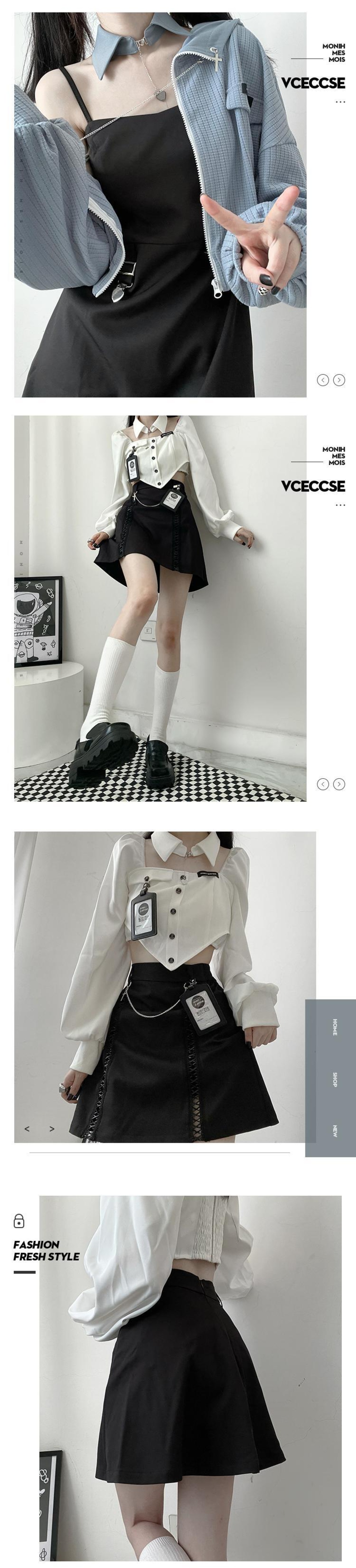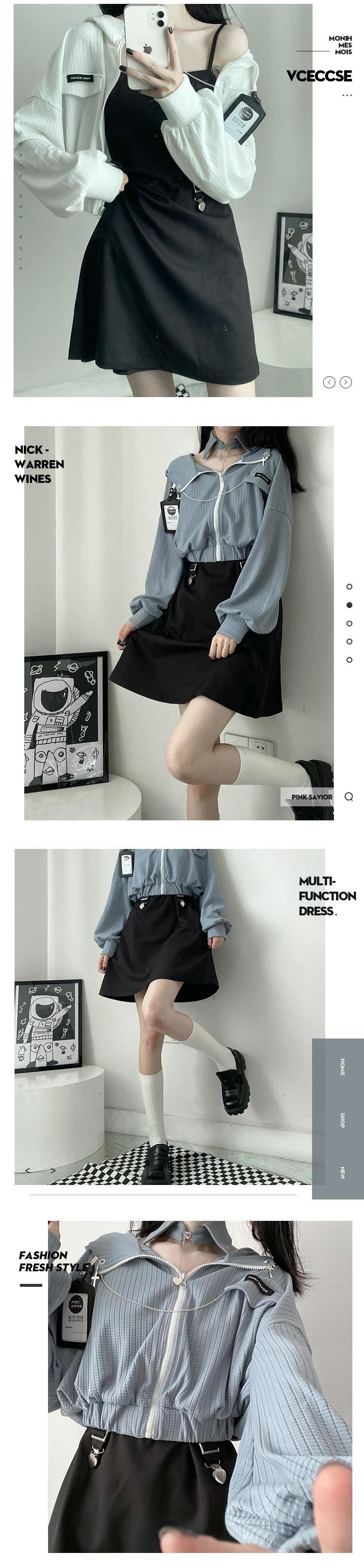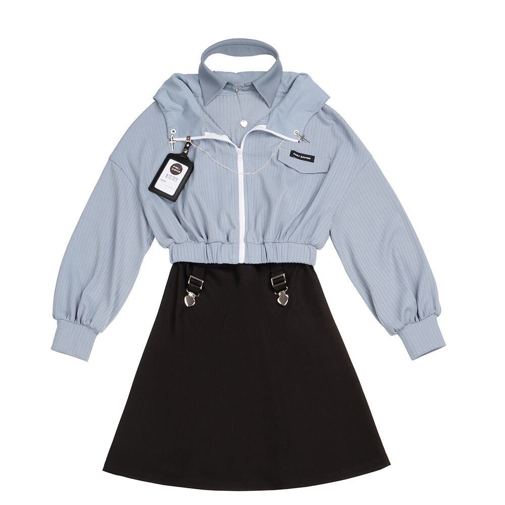 色:ブルーショートフード付きジャケット+襟なしレザーバッジ,ホワイトショートフード付きジャケット+襟なしレザーバッジ,白い三角形の裾のシャツ+襟、革のバッジを送る,青い三角形の裾のシャツ+襟、革のバッジを送る,黒のネクタイスカート,バックルサスペンダースカートが大好き
