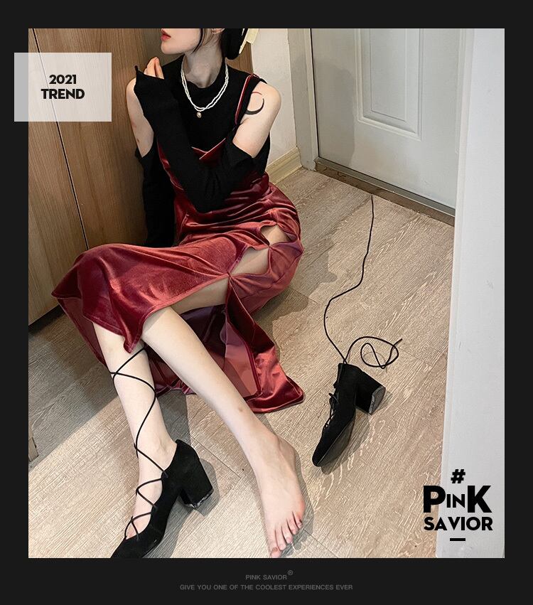 色:内側にストラップレスブラック,ロングスリングベルベットスカート,短い不規則なアリ溝スカート,レースアップブラックウールコート