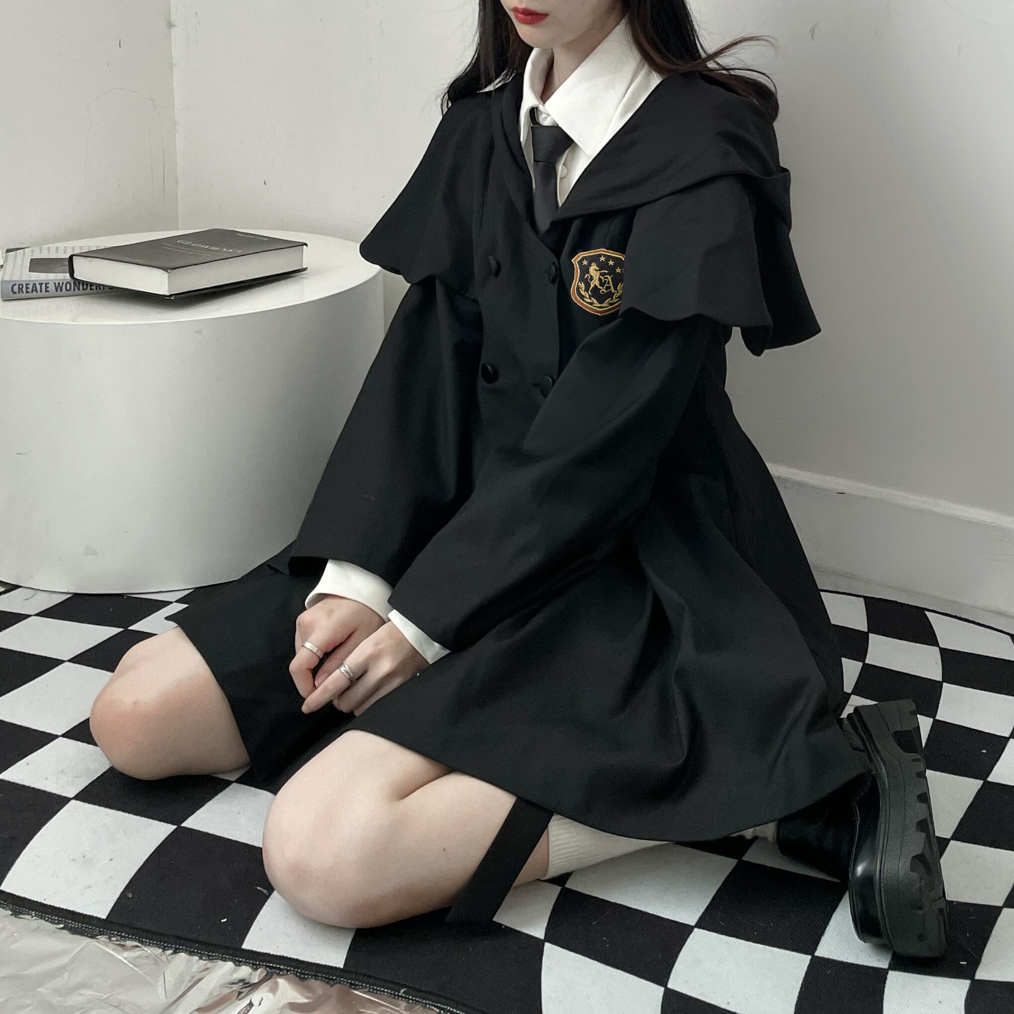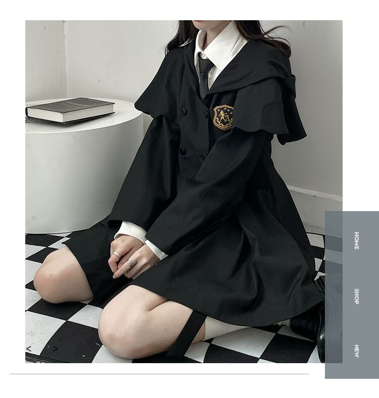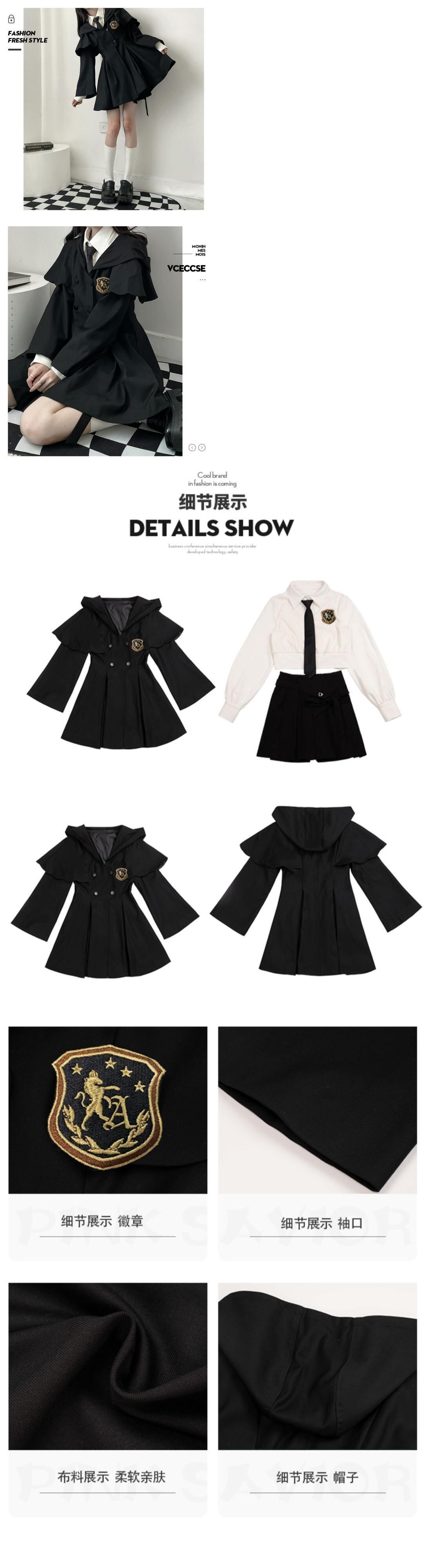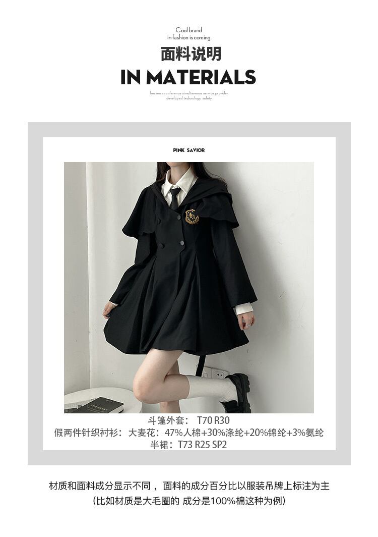 色:黒マント無料バッジ,バッジを送るための白いニットの偽のツーピースブラウス,黒スカート