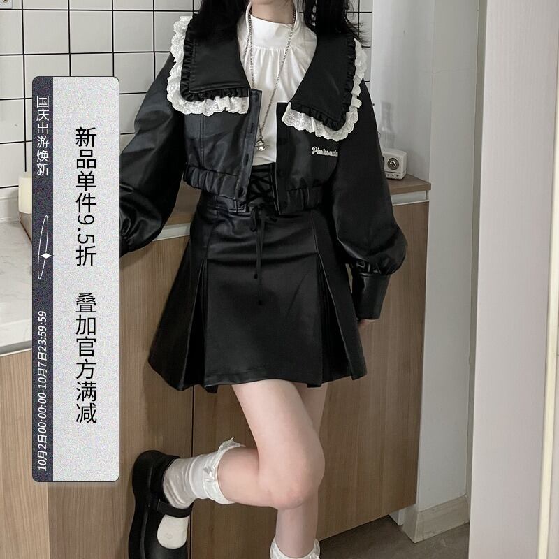 色:ブラックショートコート,黒のレースアップスカート,フリーライド